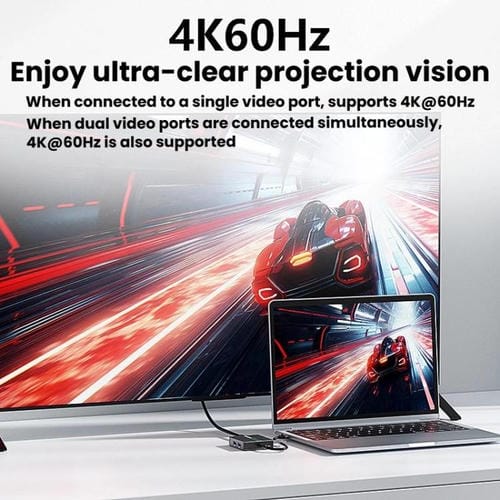 5. Disfrute de una visión de proyección de pantalla ultranítida.Al conectarlo a un solo puerto de video, admite 4K a 60 Hz.Al conectarlo a dos puertos de video simultáneamente, también admite 4K a 60 Hz.