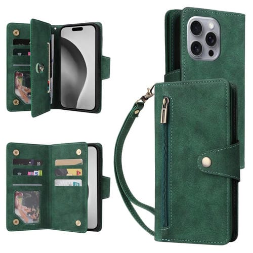 Funda de Cuero para iPhone 16 Pro con Tres Pliegues y Hebilla de Remache (Verde)
