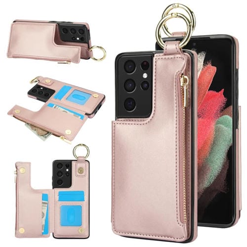 Estuche para Teléfono Samsung Galaxy S21 Ultra 5G Rfld con Cremallera y Anillo de Doble Hebilla Antirrobo (Oro Rosa)