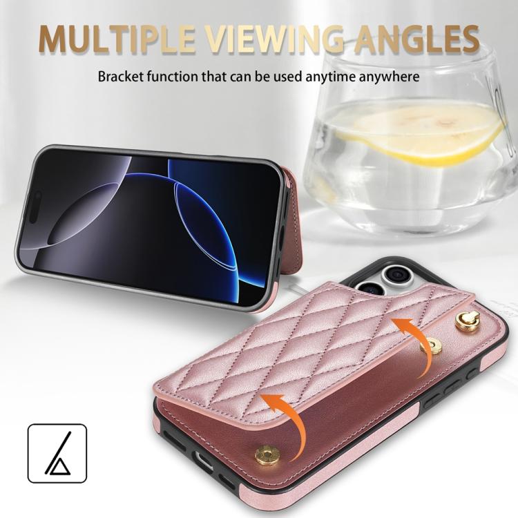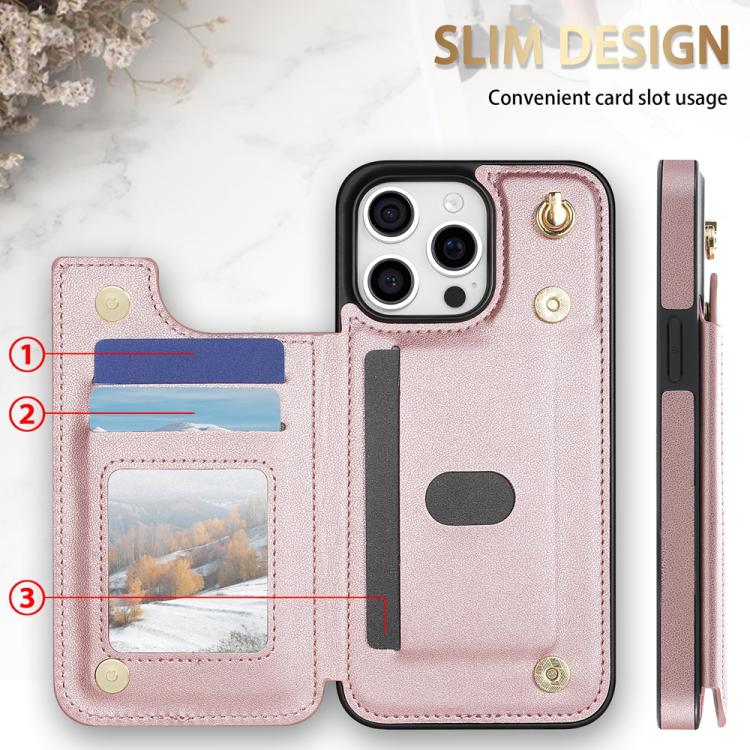 Estuche para Teléfono iPhone 16 Pro Max Ranuras Tarjetas Hebilla Doble Cordón (Oro Rosa)