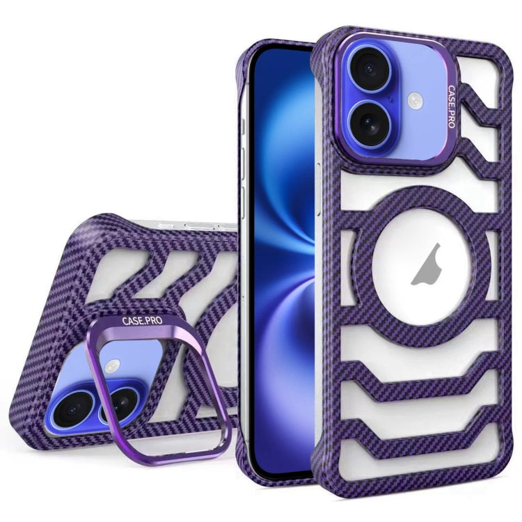 Estuche para Teléfono Magsafe con Soporte y Protección de Lente de Fibra de Carbono para iPhone 16 (Morado)