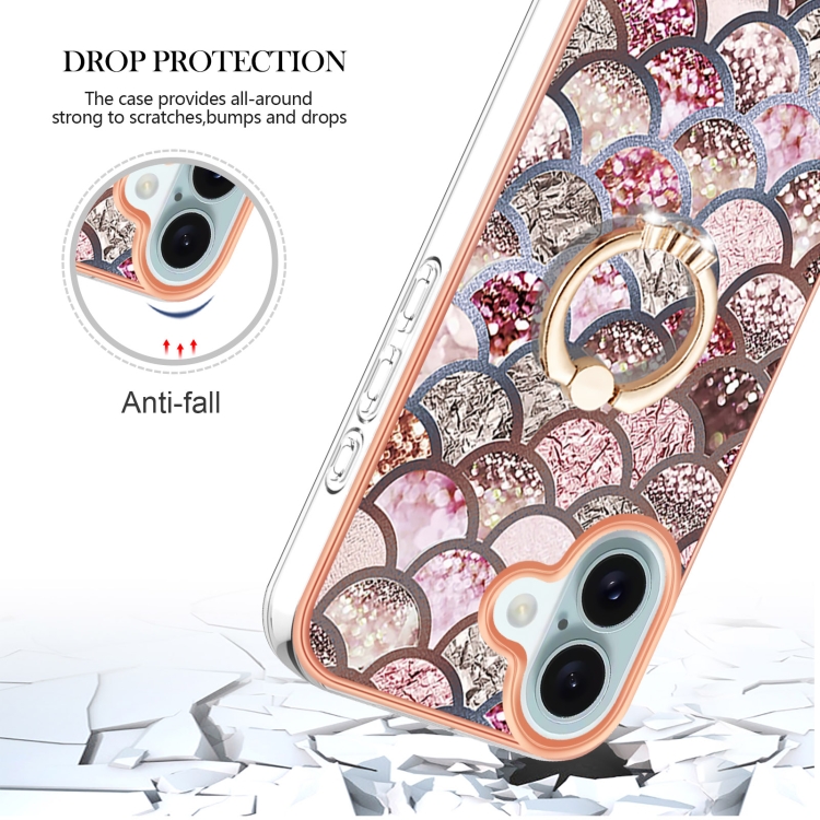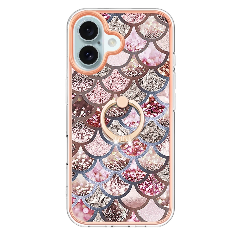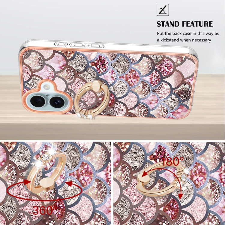 Funda para iPhone 16 TPU con Patrón de Galvanoplastia Imd y Soporte Anillo Diamantes (Escamas Rosas)