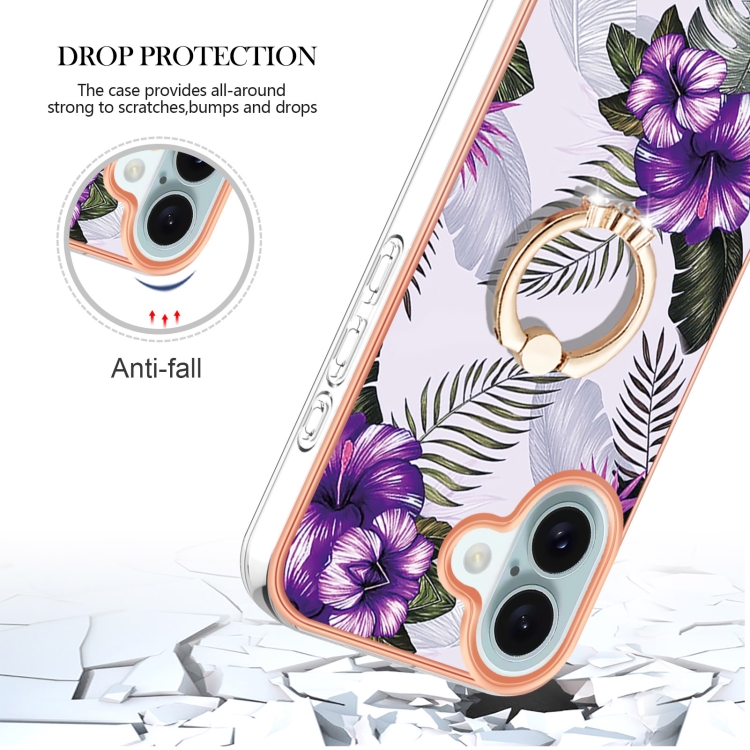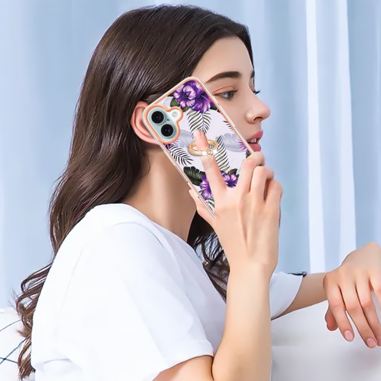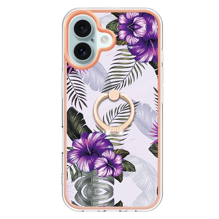 Funda a prueba de golpes TPU con patrón de galvanoplastia Imd y soporte anillo diamantes de imitación para iPhone 16 (Flor Morada)