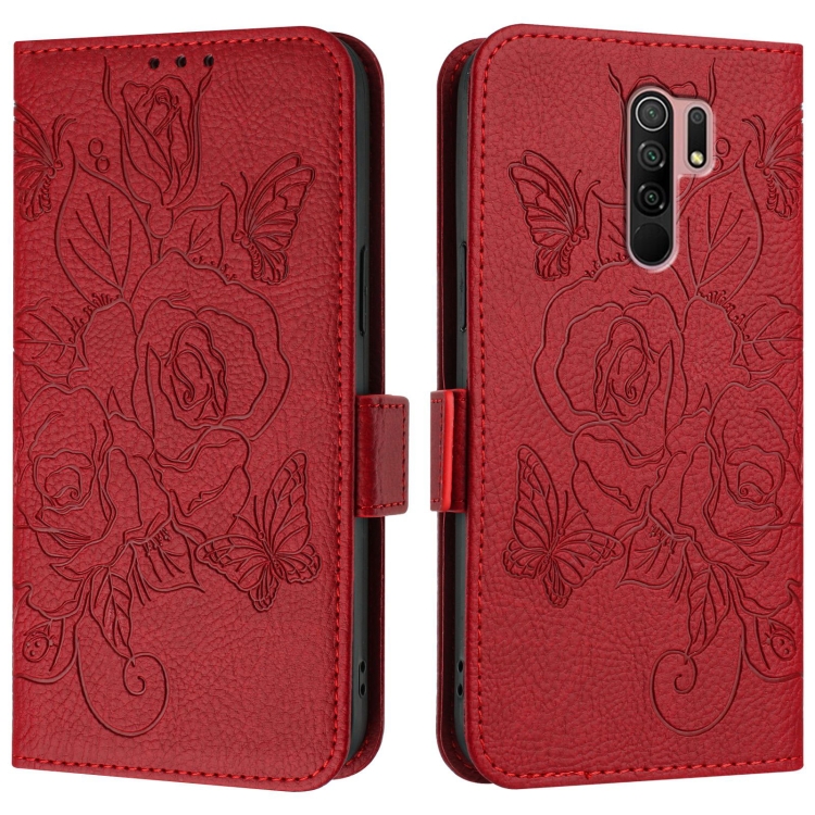 Funda de Cuero Antirrobo Rfid con Relieve En Rosa para Redmi 9/9 Prime (Rojo)