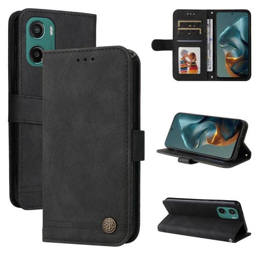 Funda de Cuero para Motorola Moto G05/E15 con Botones de Metal y Diseño Árbol de la Vida (Negro)