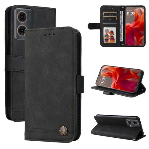 Funda de Cuero Motorola Moto G85/S50 Neo con Botones de Metal y Diseño Árbol de la Vida (Negro)