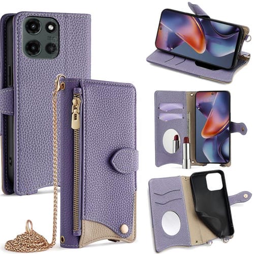 Funda de Cuero con Cadena Cruzada y Diseño Cola de Pez para Motorola Moto G 2025 (Morado)