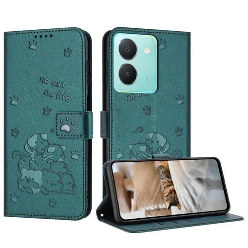 Funda de Piel con Diseño de Gatito En Relieve para Vivo Y36 4G/5G (Verde Oscuro)