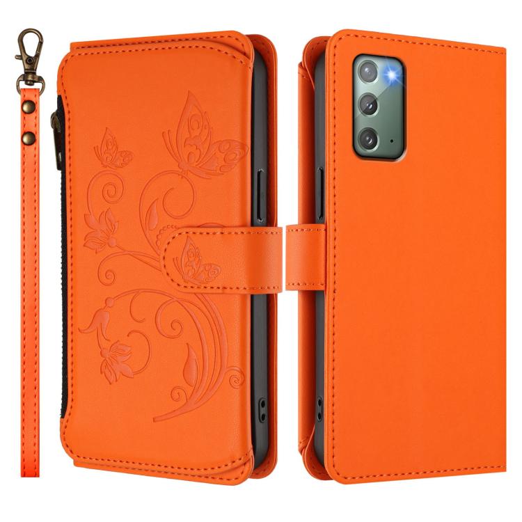 Funda de cuero con cremallera para Samsung Galaxy Note20, diseño de mariposas, flores y amor, con múltiples tarjetas (naranja)