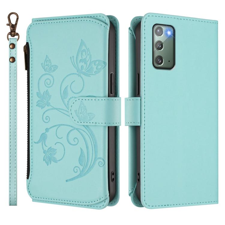 Funda de cuero con cremallera para Samsung Galaxy Note20, diseño de mariposas, flores y amor, con múltiples tarjetas (verde menta)