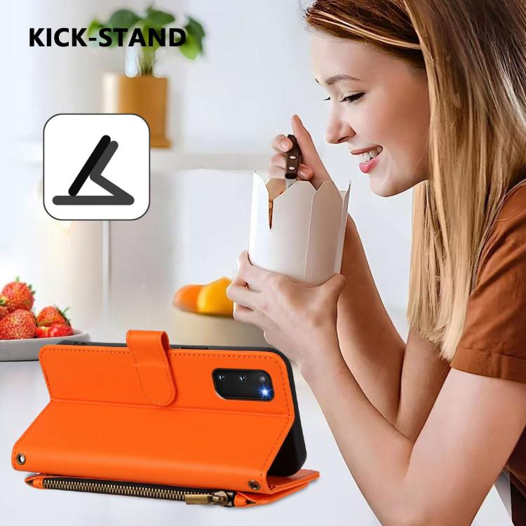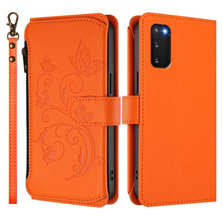 Funda de cuero con cremallera para Samsung Galaxy S20 FE, diseño de mariposas, flores y amor, con múltiples tarjetas (naranja)