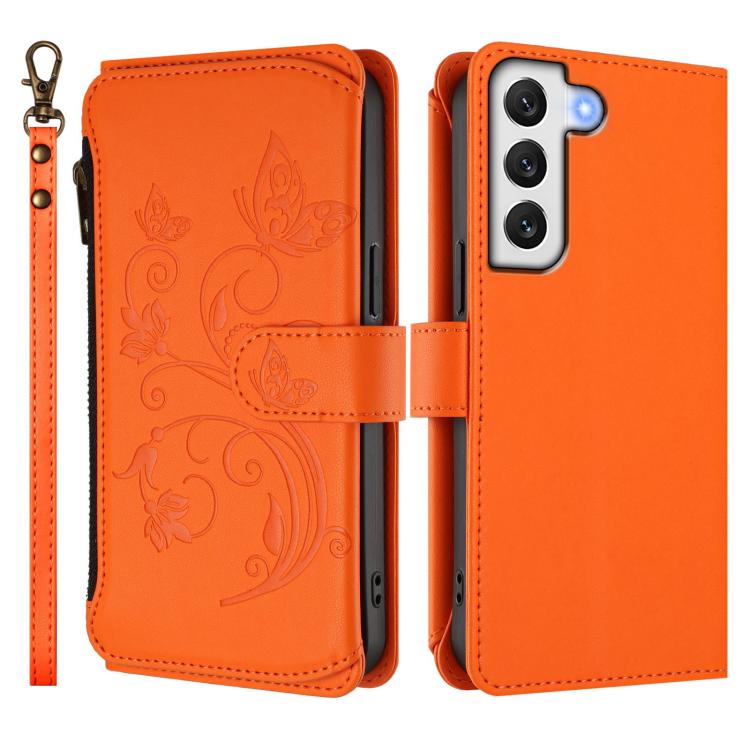 Funda de cuero con cremallera para Samsung Galaxy S21 FE 5G, diseño de mariposas, flores y amor, con múltiples tarjetas (naranja)