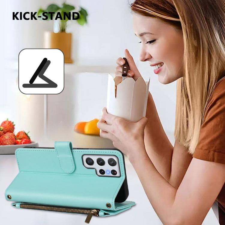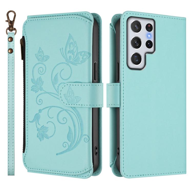 Funda de cuero con cremallera para Samsung Galaxy S22 Ultra 5G, diseño de mariposas, flores y amor, con múltiples tarjetas (verde menta)