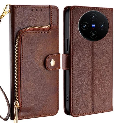 Funda de Cuero con Cremallera para Teléfono Vivo X100S (Marrón)