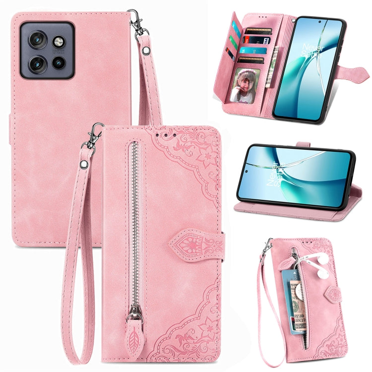 Funda de Cuero con Cremallera y Flores en Relieve para Motorola Moto S50 (Rosa)