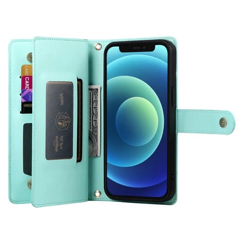 Funda de Cuero con Cremallera y 9 Ranuras para Tarjetas para iPhone 12 Mini (Verde Menta)