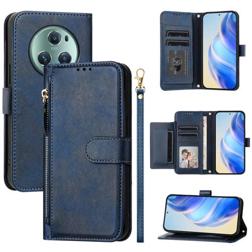 Funda de Cuero con Cremallera y Ranuras para Tarjetas para Honor Magic5 Pro (Azul)