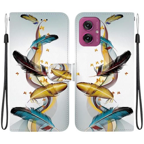 Funda de Cuero para Motorola Moto G55 con Dibujo de Colores y Textura de Cristal (Plumas de Mariposa Doradas)