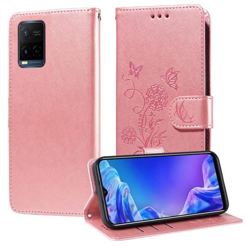 Funda de Cuero con Diseño de Mariposas En Relieve para Vivo Y21 2021 / Y21S / Y33S 4G (Oro Rosa)