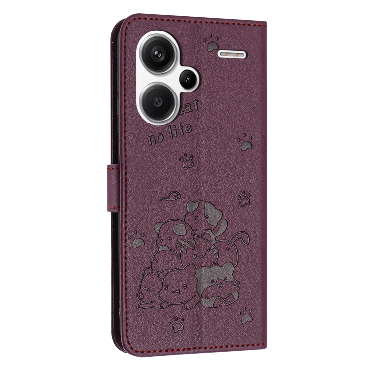 Funda de Cuero con Estampado de Gatito y Cordón para Redmi Note 13 Pro+ 5G (Rojo Vino)