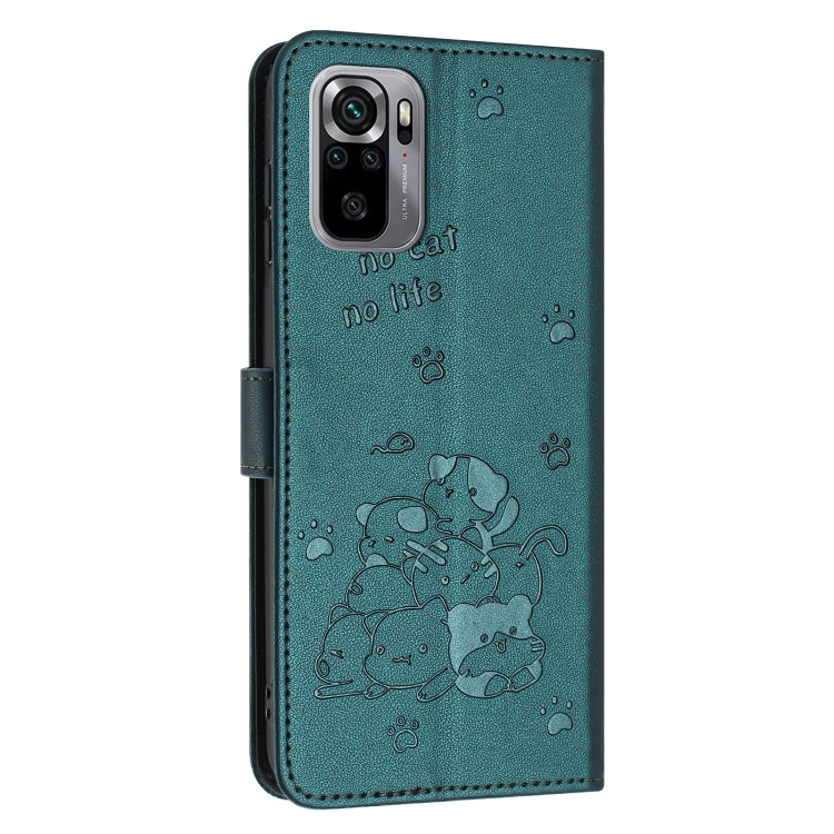 Funda de Cuero con Estampado de Gatito En Relieve Global para Xiaomi Poco M5S 4G con Cordón (Verde Oscuro)
