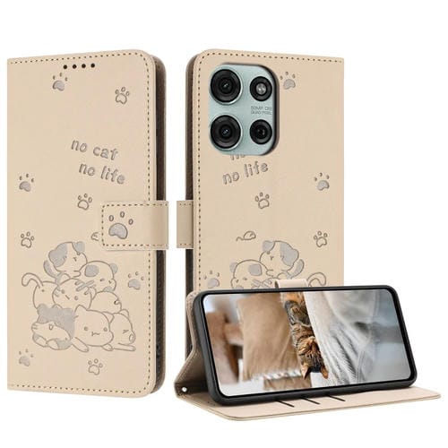 Funda de Cuero Motorola Moto G75 con Diseño de Gatito en Relieve y Cordón (Beige)