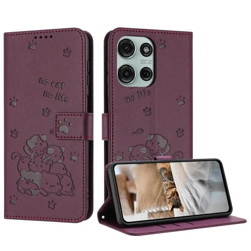 Funda de Cuero para Motorola Moto G75 con Diseño de Gatito en Relieve y Cordón (Rojo Vino)