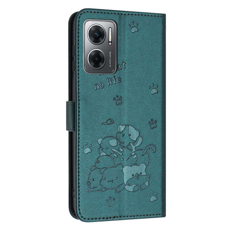 Funda de Piel con Diseño de Gatito En Relieve y Cordón para Redmi 10 5G / Note 11E 5G (Verde Oscuro)