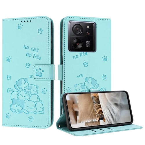 Funda de Piel con Diseño de Gatito En Relieve para Redmi K60 Ultra con Cordón (Verde Menta)