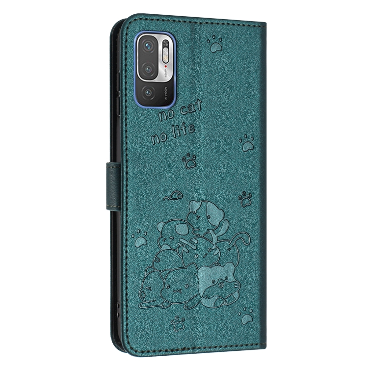 Funda de Piel con Diseño de Gatito En Relieve y Cordón para Redmi Note 10 5G/Note 10T 5G (Verde Oscuro)