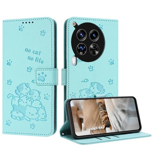 Funda de Cuero Tecno Camon 30 4G/5G Diseño Gatito En Relieve con Cordón (Verde Menta)