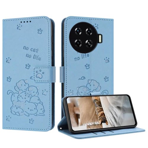 Funda de Cuero para Tecno Spark 20 Pro+ 4G con Diseño de Gatito en Relieve y Cordón (Azul)
