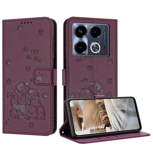 Funda de Cuero Infinix Note 40 5G con Diseño de Gatito En Relieve y Cordón (Rojo Vino)