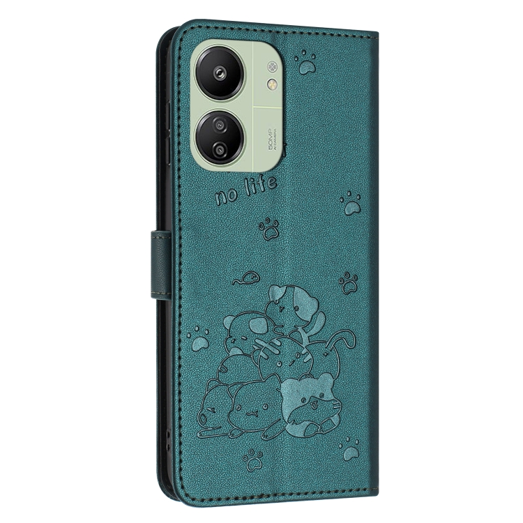 Funda de Piel con Diseño de Gatito En Relieve y Cordón para Xiaomi Poco C65/Poco M6 5G (Verde Oscuro)