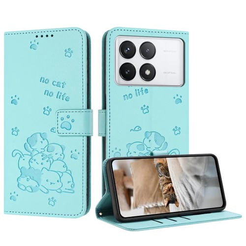 Funda de Piel con Diseño de Gatito En Relieve y Cordón para Xiaomi Poco F6 Pro 5G (Verde Menta)
