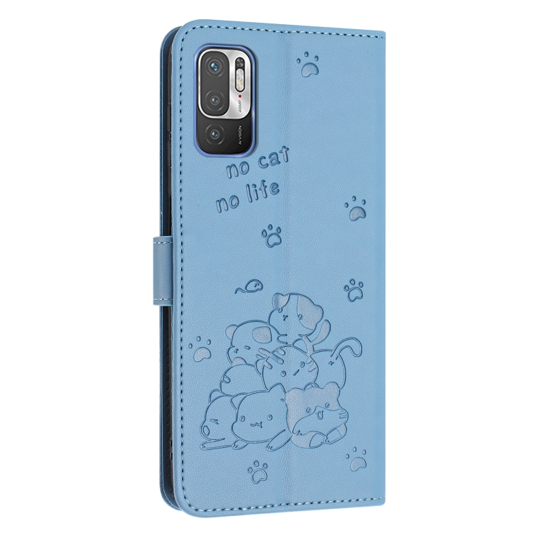 Funda de Piel con Diseño de Gatito En Relieve y Cordón para Xiaomi Poco M3 Pro 5G (Azul)
