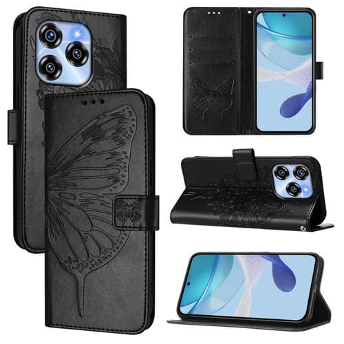 Funda de Cuero para Oukitel C50 con Diseño de Mariposa en Relieve (Negra)