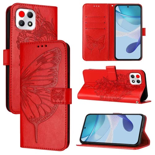 Funda de Cuero para T-Mobile Revvl 7 5G con Diseño de Mariposa en Relieve (Rojo)