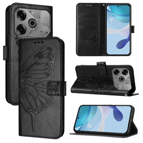Funda de Cuero para Tecno Pova 6 Neo con Diseño de Mariposa en Relieve (Negra)