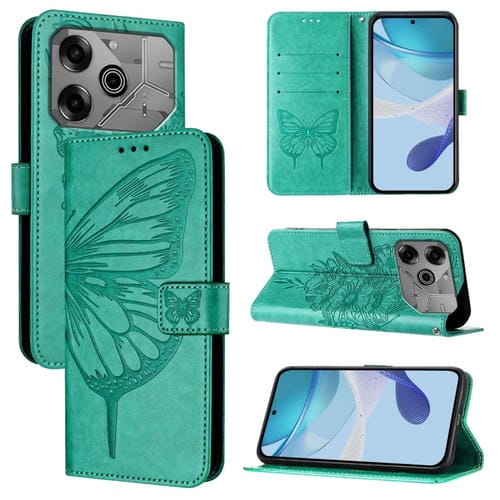Funda de Cuero para Tecno Pova 6 Neo con Diseño de Mariposa en Relieve (Verde)
