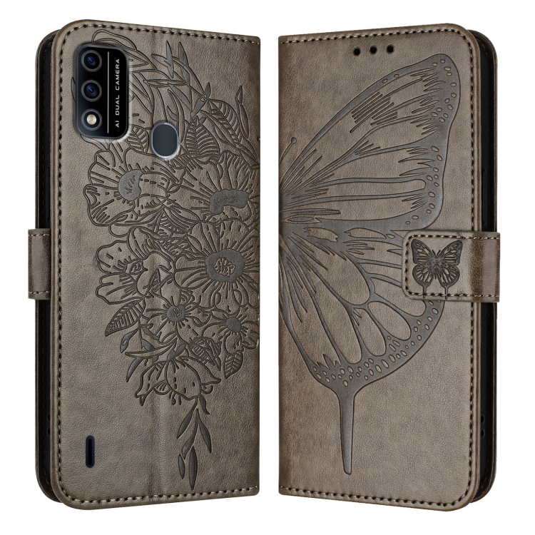 Funda de Cuero para Teléfono Itel A48 con Diseño de Mariposa en Relieve (Gris)