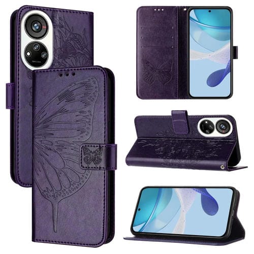 Funda de Cuero ZTE Blade V40S Diseño Mariposa En Relieve (Morado Oscuro)