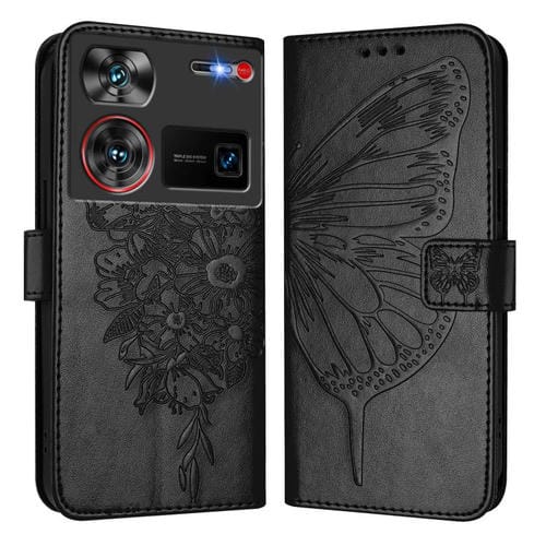 Funda de Cuero para ZTE Nubia Z60 Ultra con Diseño de Mariposa en Relieve (Negra)