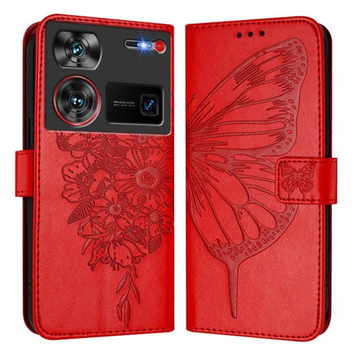 Funda de Cuero para ZTE Nubia Z60 Ultra con Mariposa en Relieve (Roja)