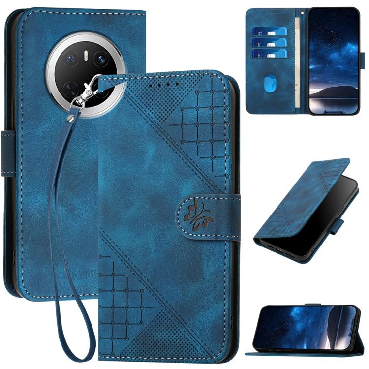 Funda de Cuero para Huawei Mate 70 con Diseño de Mariposa En Relieve y Cordón (Azul Oscuro)