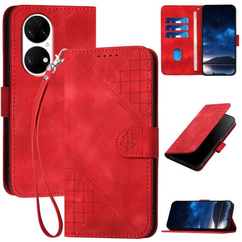 Funda de Cuero Huawei P50 con Diseño Mariposa en Relieve y Cuadrícula con Cordón (Rojo)