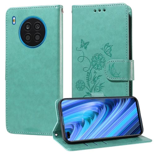 Funda de Cuero para Honor 50 Lite/X20/Huawei Nova 8I con Diseño de Mariposas y Flores en Relieve (Verde)