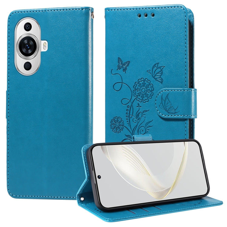 Funda de Cuero Huawei Nova 12S 4G con Diseño de Mariposas y Flores en Relieve (Azul)
