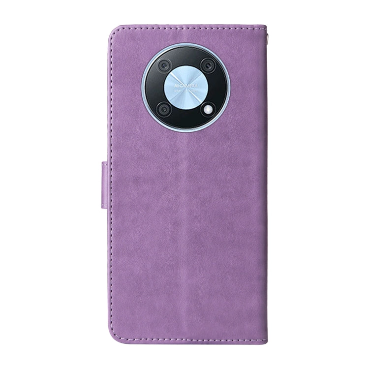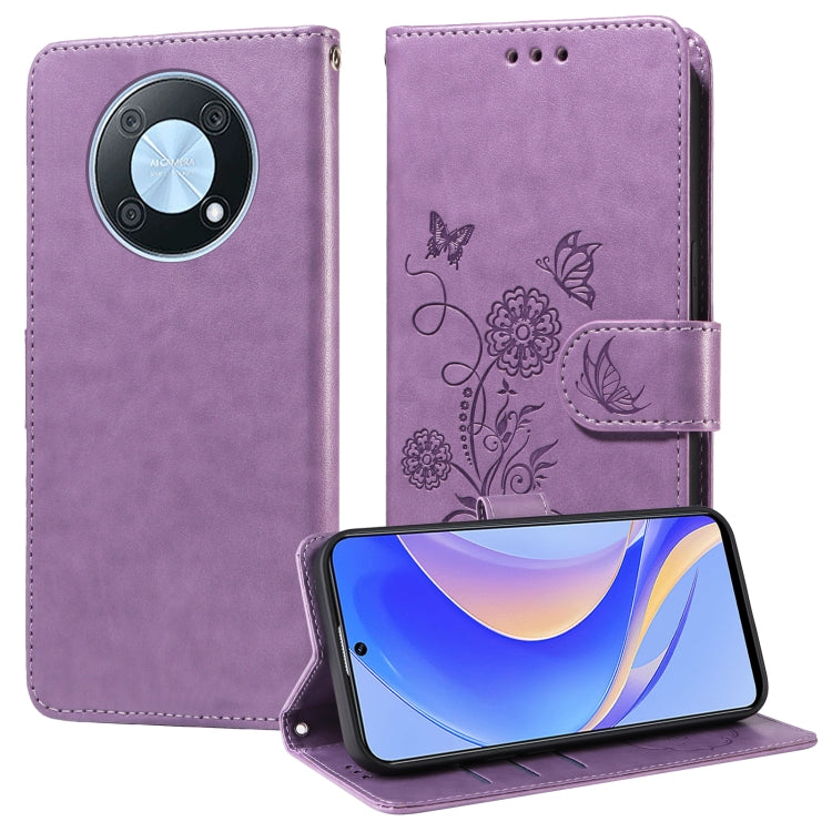 Funda de Cuero Huawei Nova Y90 con Diseño de Mariposas y Flores en Relieve (Morado)