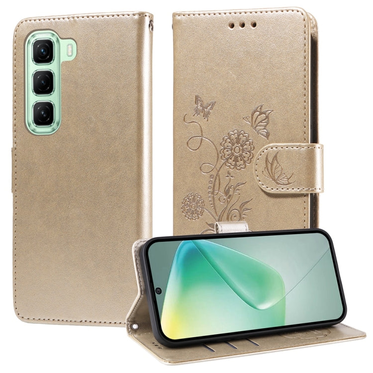 Funda de Cuero para Infinix Hot 50 5G con Diseño de Mariposas y Flores en Relieve (Dorada)